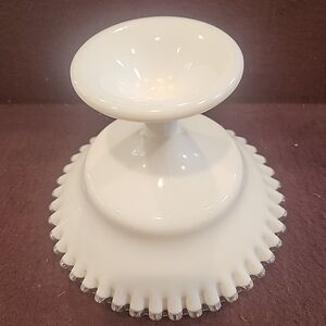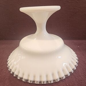 Vintage Fenton Silver Crest Milk Glass Candy Dish. No apparent defects. Pedestal base is 4". Height 5.5". Width of dish is 8". Lovely white ruffled top with clear glass edge.