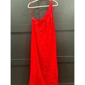 This silky maxi dress designed in a shapeless silhouette features a one-shoulder bow tie strap and gathered-pleat detailing from neckline.