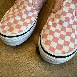 Fun pink and white checkered design. Easy slip-on style. Perfect for active kids. Great. Minimal signs of wear.