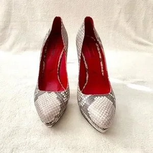 Stunning Cesar Paciotti Classic Platform Pump in Gray & Beige Python pattern with a bold red interior. Signature Dagger Heel and Lace Print Sole.