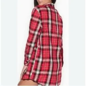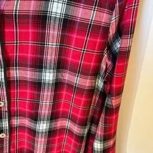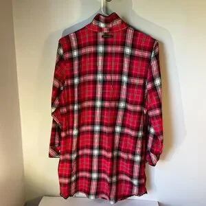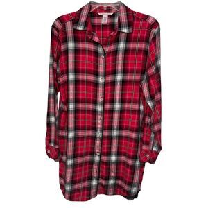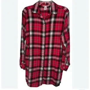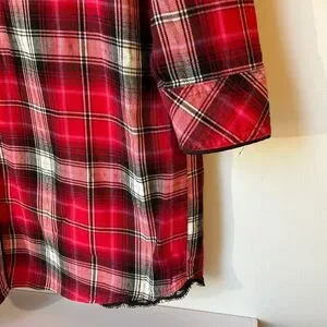 Victoria’s Secret Vintage Button Up Sleepshirt Nightgown. Medium Red black and silver tartan plaid. Subtle sparkle. Collared. Buttoned cuffs and lace detail at bottom hems. Flannel feel, cotton blend. Flat lay 33” L 20” P-P Straight cut. #country #heritage #christmas
