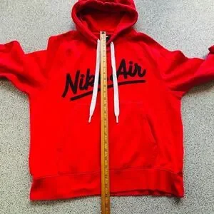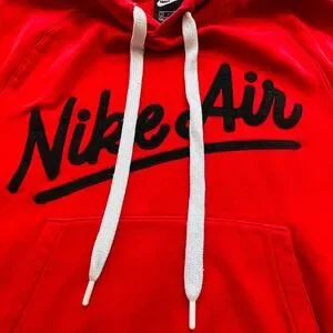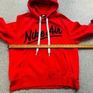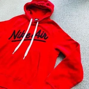 Keywords: Nike hoodie, Nike Air, red hoodie, mens hoodie, pullover hoodie, sweatshirt, hooded sweatshirt, Nike sweatshirt, Small hoodie, black logo, athletic wear, casual wear, sportswear, Nike Air hoodie