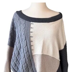 Chic off-the-shoulder design. Features a stylish mix of gray and cream. Perfect for layering.