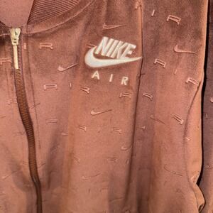 Up for sale is a Nike Air Velour Bronze Eclipse Full Zip Jacket in Women's Size XXL. This jacket features a soft velour outer shell material and a polyester lining material, making it a comfortable and breathable choice for any season. It also comes equipped with convenient features such as a full zip closure, pockets, and Nike Air accents.