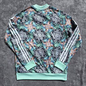Vibrant adidas track jacket featuring an allover tropical parrot and foliage print with classic 3-stripe detailing down the sleeves. Full-zip front, ribbed cuffs and hem, and a comfortable relaxed fit. Great for casual wear, layering, or athletic outfits.