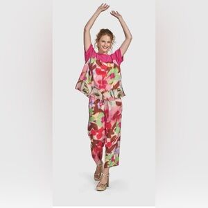 Vibrant floral patterned pants with red, pink, and green hues. Perfect for a bold look.