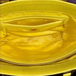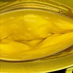 Stylish MCM tote bag. Bright yellow color. Gold-tone hardware. Perfect for everyday use. Exterior is in excellent condition, small rubbing on one of the handles and some cracking on the edge of a handle, it is noted in pictures. The interior does need some cleaning, but it’s just basically washing it up nothing that can’t be done. Overall, this bag is in good condition and the color is absolutely beautiful.