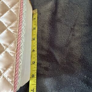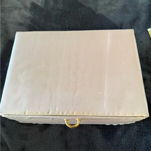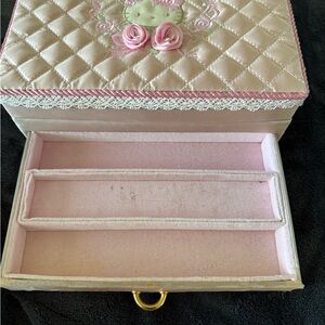 Charming quilted jewelry box in pink with an embroidered design. Features a delicate floral pattern and a secure closure.