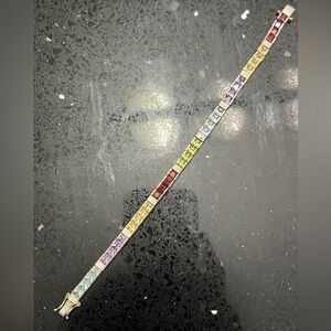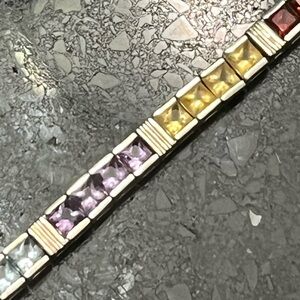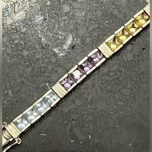 This gorgeous vintage bracelet is from 1999 QVC collection it features princess cut channel set genuine gemstones in amethyst, citrine, garnet, peridot, and blue topaz.