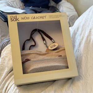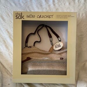 Chic crochet shoulder bag by The Sak. Cream and tan stripes. Ideal for everyday use.