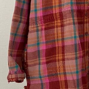 Oversized plaid full button down. Pink, orange, and teal colors. Side pockets. One button on each sleeve end. Frayed hem detailing and contrast stitching throughout.