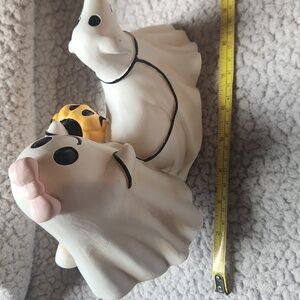 Adorable ghost dog figurine perfect for Halloween decor. Features a cute ghost with a pink bow riding a white dog. Ideal for pet lovers and festive displays.