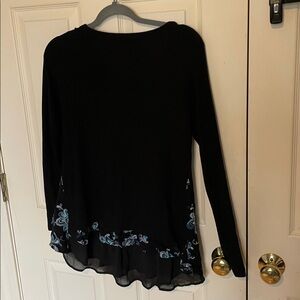 Chic black long sleeve sweater by Karen Kane. Features blue floral accents. Ideal for versatile styling. Size extra small, but runs a bit bigger- measures about 17 inches across the shoulders 19 inches across the armpits and is 26 to 30 inches long due to the high low hem- only there’s a handful of times