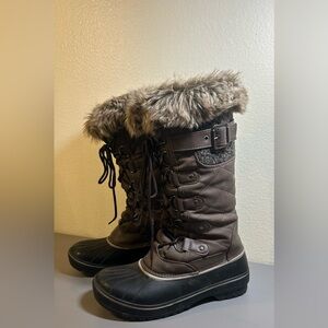 Cozy fur trim. Secure lace-up design. Durable for winter wear. Some wear see pictures.