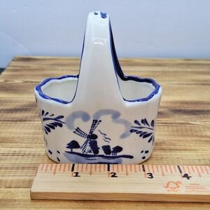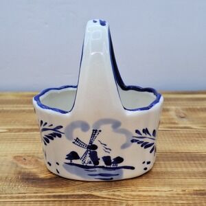 Blue and White Porcelain Handled Basket with Windmill Scene Unbranded. Condition is Used. Shipped with USPS Ground Advantage.