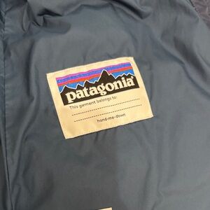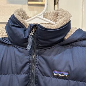 Warm navy puffer Down Sweater jacket by Patagonia. Features a cozy cream lining and hood with secure zipper closure.