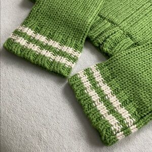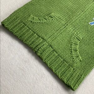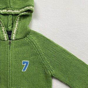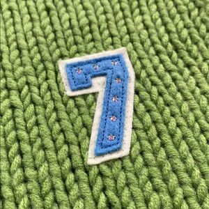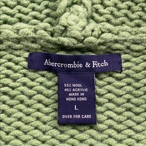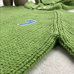 This Abercrombie & Fitch Wool Blend Long Sleeve Hoodie Sweater Jacket has a midweight, soft chunky knit, slightly hairy, stretchy feel with 2 pockets, number “7” patch embellishment detail at left chest, and varsity striped details at hood/sleeve ends. A nice, fun, and cozy preppy style sweater jacket/cardigan.