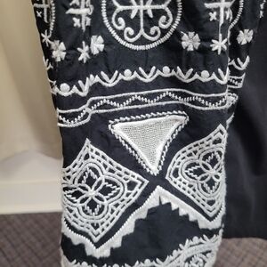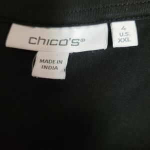 Pretty Chico's Size 4/XXL =20/22 Black top with white embroided and eyelet cut puffy sleeves. 25" PTP , 26" long, with stretch. BoHo style