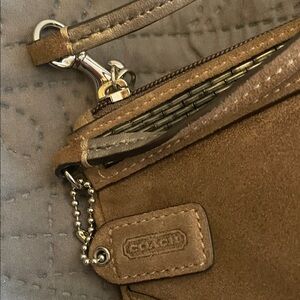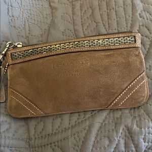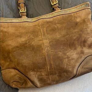 Stylish Coach satchel with matching wallet in tan suede and gold beading. Features elegant gold accents. Perfect for any occasion. Some of the beading has come loose and a good suede cleaner would brighten her up but the inside is perfect! She has many more years of love to give!