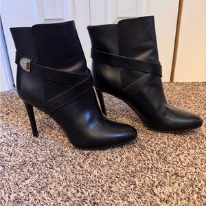 Chic black heeled boots by Dior. Features a stylish silver buckle. Perfect for elevating any outfit.