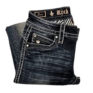 Rise: 8in. Bottom Leg Width 5.5in. Materials: See Image. 2% Elastane Stretch, 5 Pockets, Single Button Zip Front, Designer Pockets, Designer Buttons, Heavy Stitching.