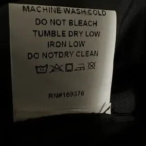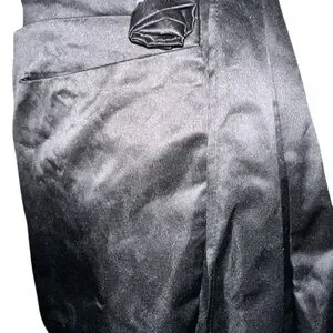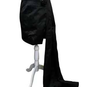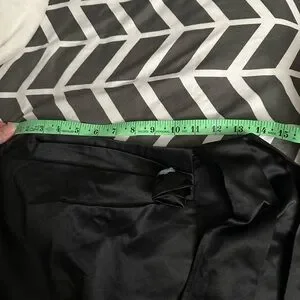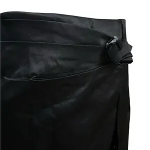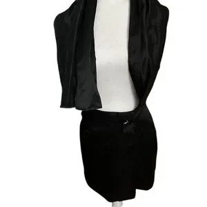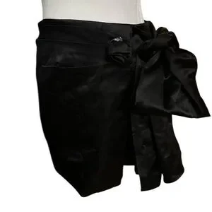 Designer Another Mode women’s black mini skirt. Formal, dressy attire. Asymmetrical front, lined, 3 matching fabric decorative detachable roses on front, 3 draped pleats on front, long affixed pleated drape, back zipper closure. Fabric is polyester but looks and feels like satin.