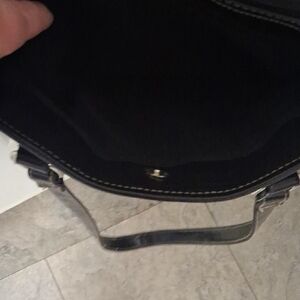 Elegant black handbag with dual handles. Includes a convenient front pocket.