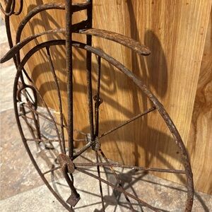 Rustic metal penny farthing bicycle decor. Perfect for garden or home display. Great craft piece. 19”X19”
