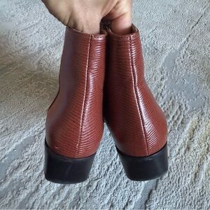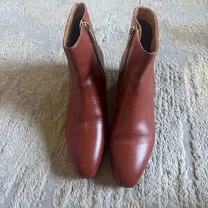 Elegant brown ankle boots. Textured leather finish. Low block heel. Perfect for versatile styling.
