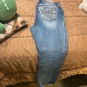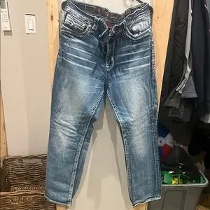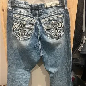 Stylish straight leg jeans with intricate stitching on back pockets. Ideal for everyday style.