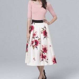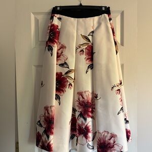 Chic A-line skirt with bold floral print. Features rich red, pink, and creamy white tones. Ideal for stylish outings. Excellent condition- like new!