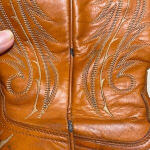 Well loved Ariat boots with detailed stitching and squared toe. Very distressed and broken in as shown in photos. Still a lot of life left in these boots. Good overall condition With wear and distressing as shown in photos. Great for the rodeo!