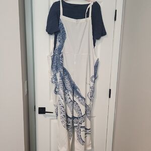 Women's nautical Blue and white squid wide legged bib overalls. Size XL