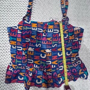 Vibrant peplum top with a bold graphic print. Features a mix of blue, orange, red, and yellow colors.please see pictures it have one bottom missing