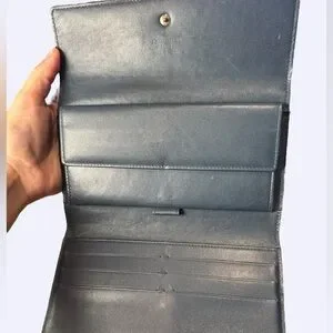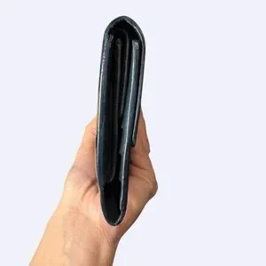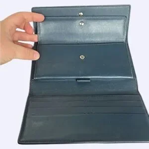 • Organized interior featuring multiple card slots, bill compartments, and a zippered coin pocket.
