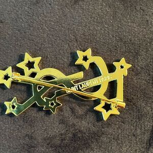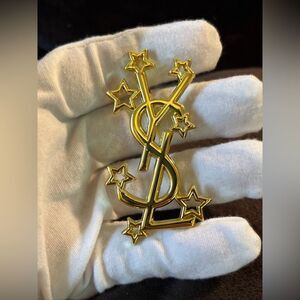 The Goldtone YSL Brooch with Stars is a stylish and unique accessory from the renowned brand Yves Saint Laurent. The brooch features stars shape design in a beautiful gold color, perfect for adding a touch of beauty and elegance to any outfit. Made of Golden metal, this 2.5" brooch is a perfect statement piece for those who love astrology and signs & symbols. MSRP $600 Comes in a gift box.