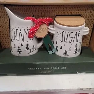 Rae Dunn set with whimsical tree design. Includes red ribbon accent. Perfect for kitchen decor.
