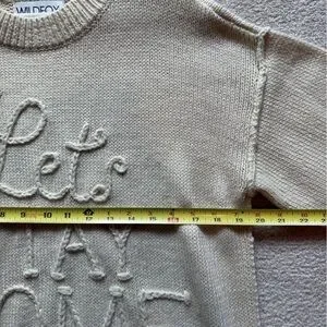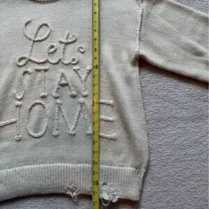 Super cozy and warm oversized wool blend sweater from Wildfox. Distressing on the cuffs and hem with “let’s stay home” stitching on the front. Only worn once or twice and in great condition. Size small. I live in a smoke-free/pet-free home.