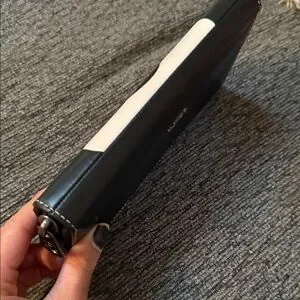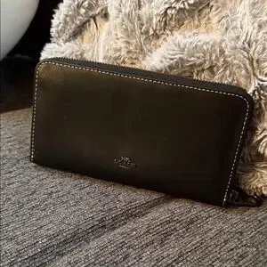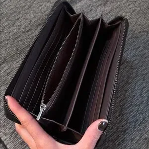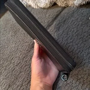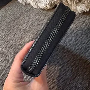 Purchased from Coach when they had the Disney line. Can hold up to 12 cards. There is a zippered section in the middle as well as a slot for cash or receipts. There is some wear on the outside. There are two small scratches on the back, as well as white marks on the back left corner.