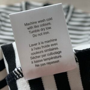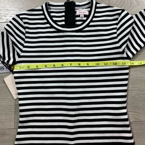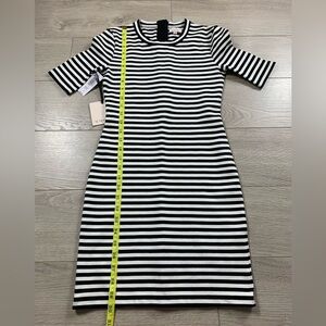 Dress features black and white horizonal stripes, short sleeves and exposed back zipper