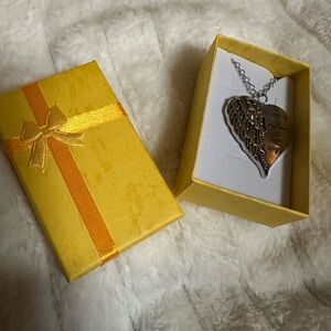 Elegant silver tone heart pendant with wing design. Features engraved text.