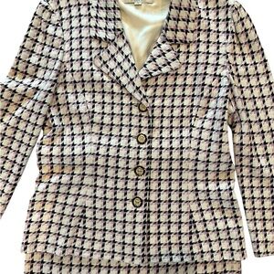 This chic St. John suit set features a sleek pencil silhouette in a classic and fun black, pink and white color palette. Perfect for both work and cocktail occasions, the length adds a modern touch to your ensemble. The set of two pieces offers versatile styling options for a polished and sophisticated look.