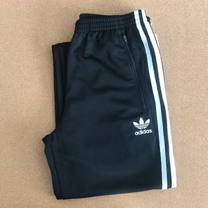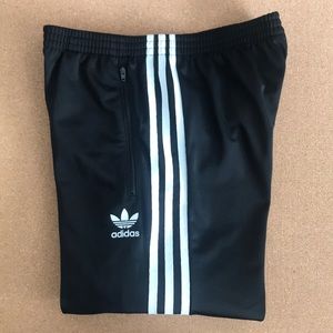 Adidas track pants. Black with the traditional 3 stripes down the side of the pant legs. Straight leg. Front zippered pockets. NWT, never worn!