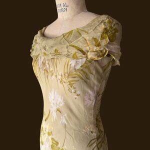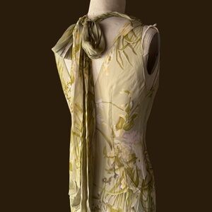 Vintage 90s Chetta B. Evening super rare green floral silk maxi dress! Screen accurate Friends TV show, Monica and Chandler Bing’s wedding, Phoebe Buffay and Rachel Green Bridesmaid dresses. Gorgeous maxi dress with cowl neck and hibiscus print! In excellent condition, size 6 womens. No zipper, pull over style dress. Lining underneath. 100% silk dress. Made in USA. The cowl and tie in the back can also be worn multiple ways!