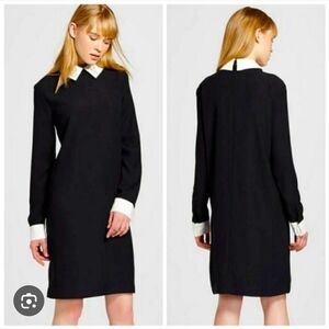 Elegant black dress with white collar and cuffs. Long sleeves. Perfect for formal occasions.