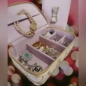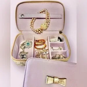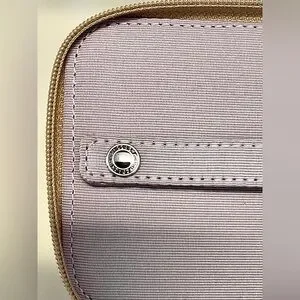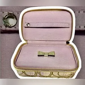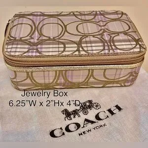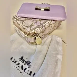 Chic Coach zip around jewelry box in a tan and lavender paid with gold kissing C’s pattern. Lavender interior with snap bracelet holder, gold bow lid over divided sections. EUC 6.25”W x 4” x 2” in dust bag. Ideal for storing your treasures in style & travel.
