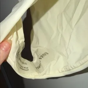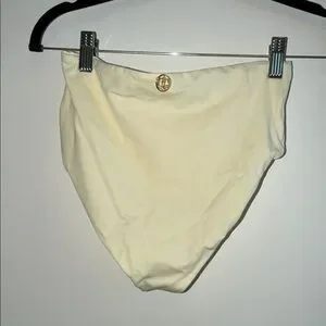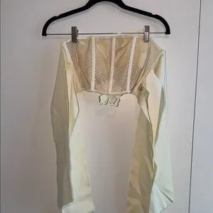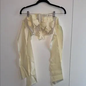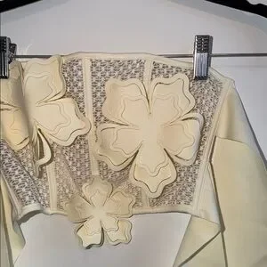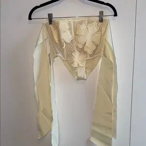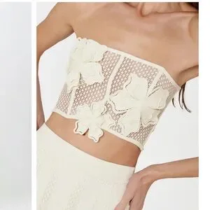 This elegant cream bikini top features intricate floral patterns and stylish long sleeves, perfect for a sophisticated beach look.