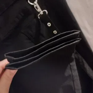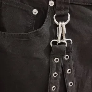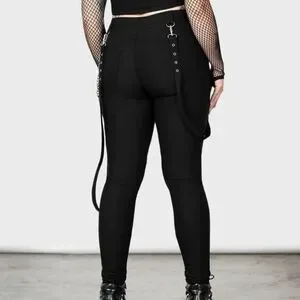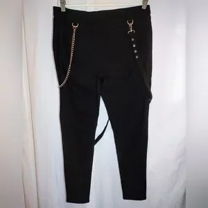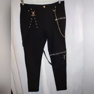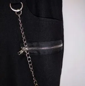 Stretch fabric. Detachable chains. Statement zipper details. Belt loops. Fitted.