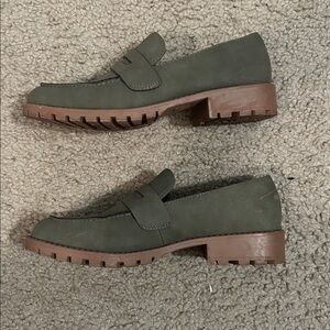 Stylish olive green loafers with a rugged sole. Ideal for casual wear.