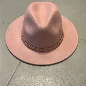 Elegant fedora in soft pink. Features a decorative band. Perfect for stylish outfits. NWT